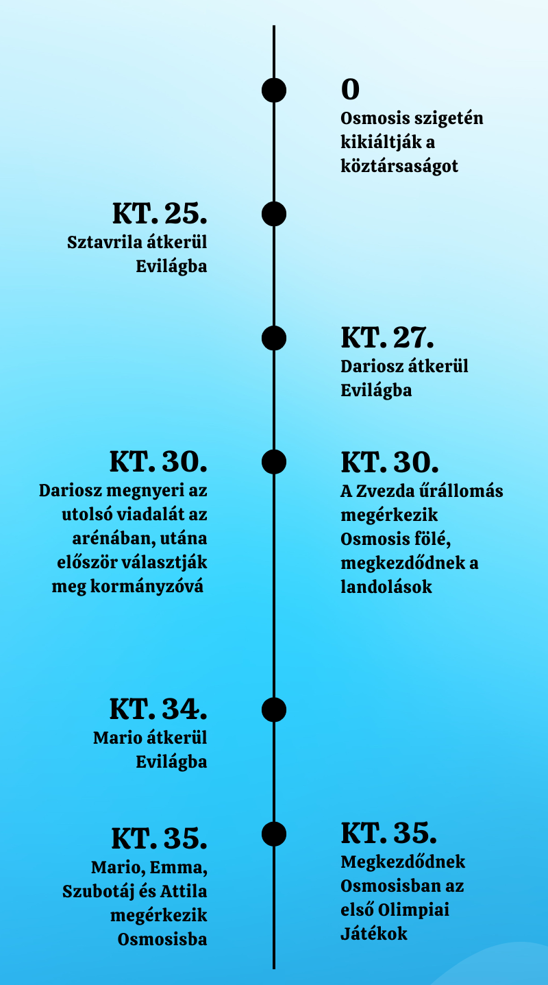 Ha az első ötven fejezet elolvasása után úgy érzed, hogy az idővonallal kapcsolatban nem tiszta számodra valami, akkor tekintsd át az alábbi ábrát. (Ha ezt túl hamar teszed meg, akkor találhatsz a végén spoilert is.) Az idővonalon a nullpont Osmosis Köztársaság kikiáltását jelenti, a szigeten ekkor lép életbe az új időszámítás. Ennek megfelelően például a KT. 30. azt jelenti, miszerint a Köztársaság harmincadik évében.